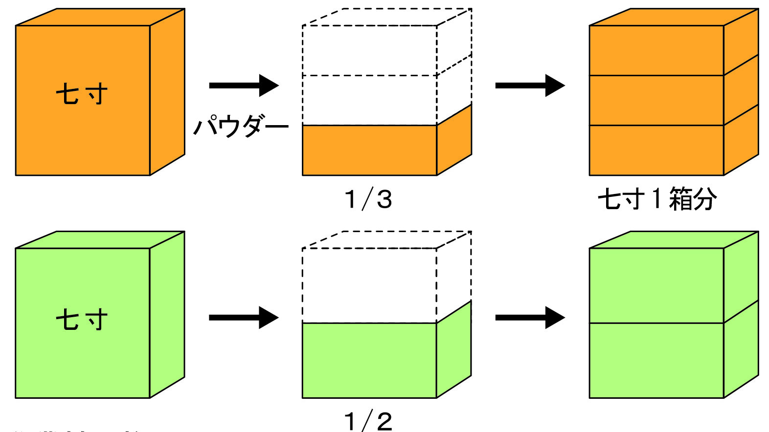 パウダー加工作業を加えることにより、ご遺骨の体積が約1/3程度になり真空処理をして、当社オリジナル重ね型ご遺骨箱へ収納し【七寸箱】1箱分面積で3柱分可能です。